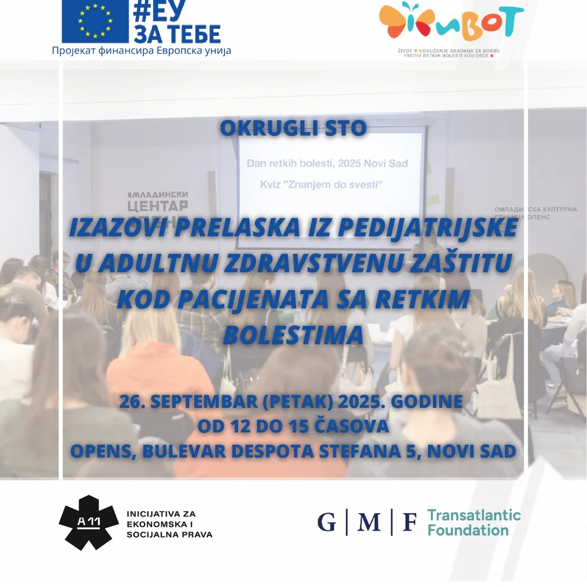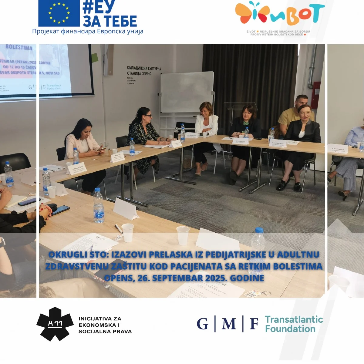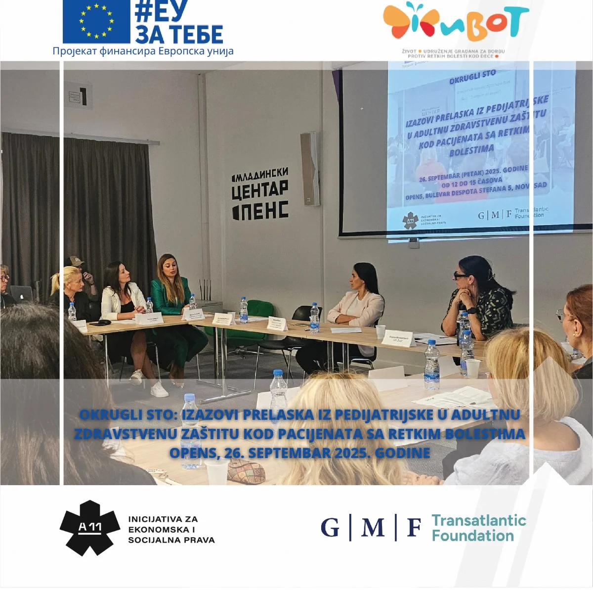 Udruženje za borbu protiv retkih bolesti kod dece „Život“ je 26. Septembra 2025. u prostorijama OPENS Centra u Novom Sadu održalo okrugli sto posvećen temi „Problemi u ostvarivanju zdravstvene zaštite pacijenata obolelih od retkih bolesti pri prelasku iz pedijatrijskog u adultno doba“. Ovaj Okrugli sto je održan u okviru projekta koji realizuje udruženje „Život“ uz finansijsku podršku Evropske unije u Srbiji. Nosilac projekta je „Život“ udruženje građana za borbu protiv retkih bolesti kod dece, uz podršku– Inicijative za ekonomska i socijalna prava A11, Transatlantske fondacije (German Marshall Fund) i Evropske unije u Srbiji u okviru inicijative EU za tebe.